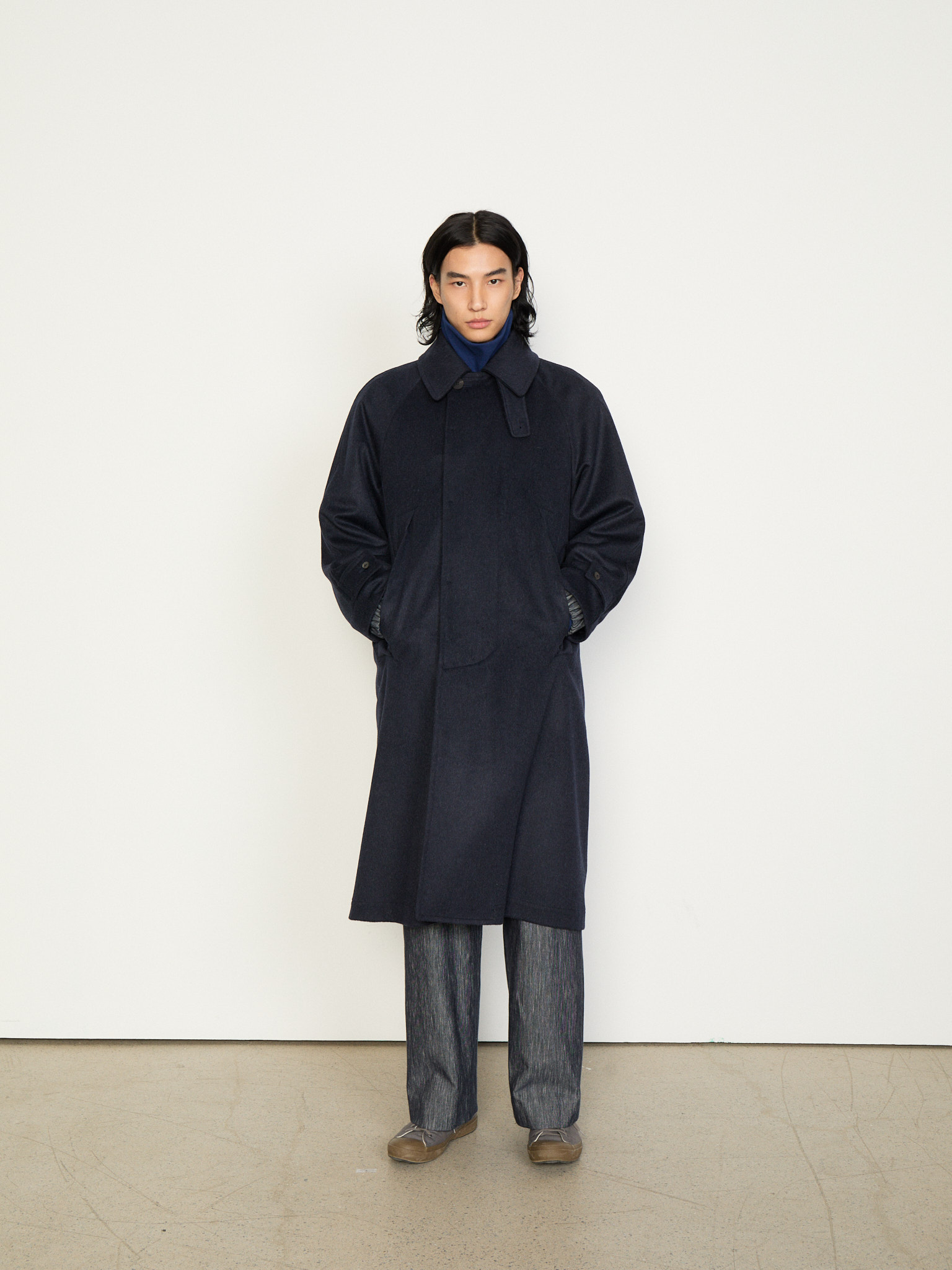 A long coat with a gentle A-line silhouette that drapes gracefully with movement.The back inverted pleat adds fluidity and ease,creating a quiet rhythm between structure and flow.