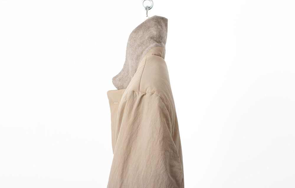 따뜻한 컬러감의 베이지 컬러가 매력적인 두툼한 6온스의 패딩이 들어간 코트로써, 베이지 컬러와 두툼한 패딩이 주는 입체감의 실루엣이 돋보입니다.