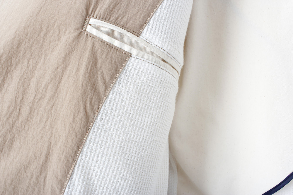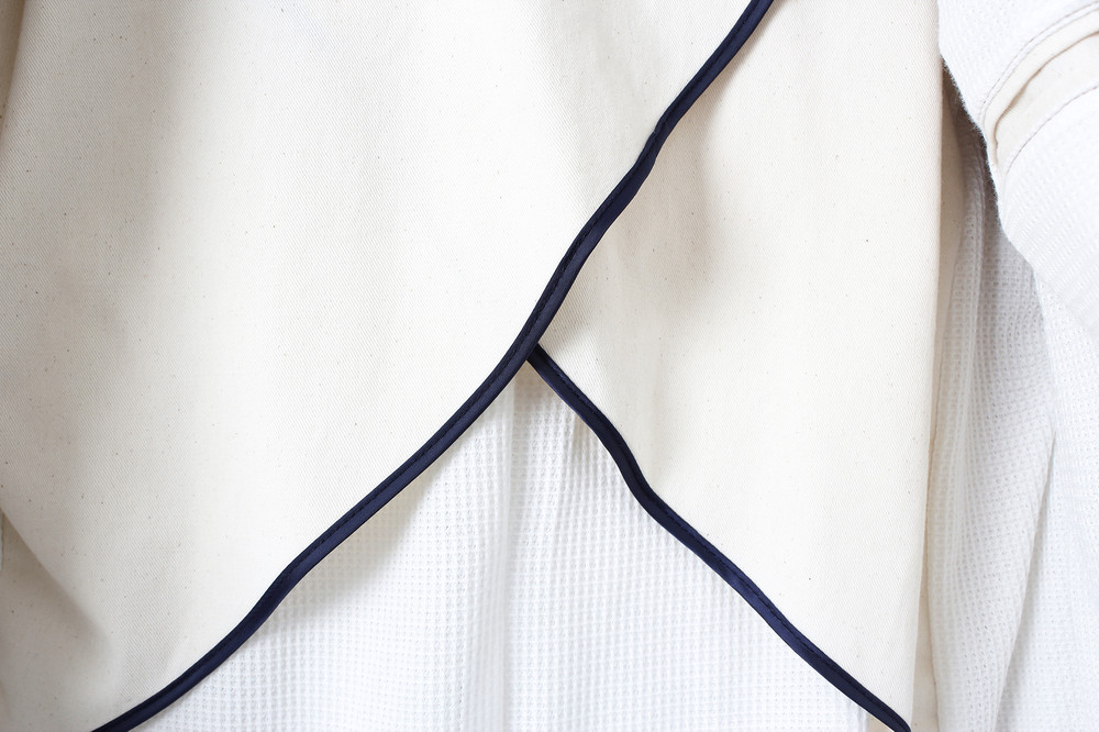 무표백한 트윌 원단이 라벨을 받쳐주고 있으며, 네이비 컬러의 배색된 파이핑 처리가 고급감을 줍니다.