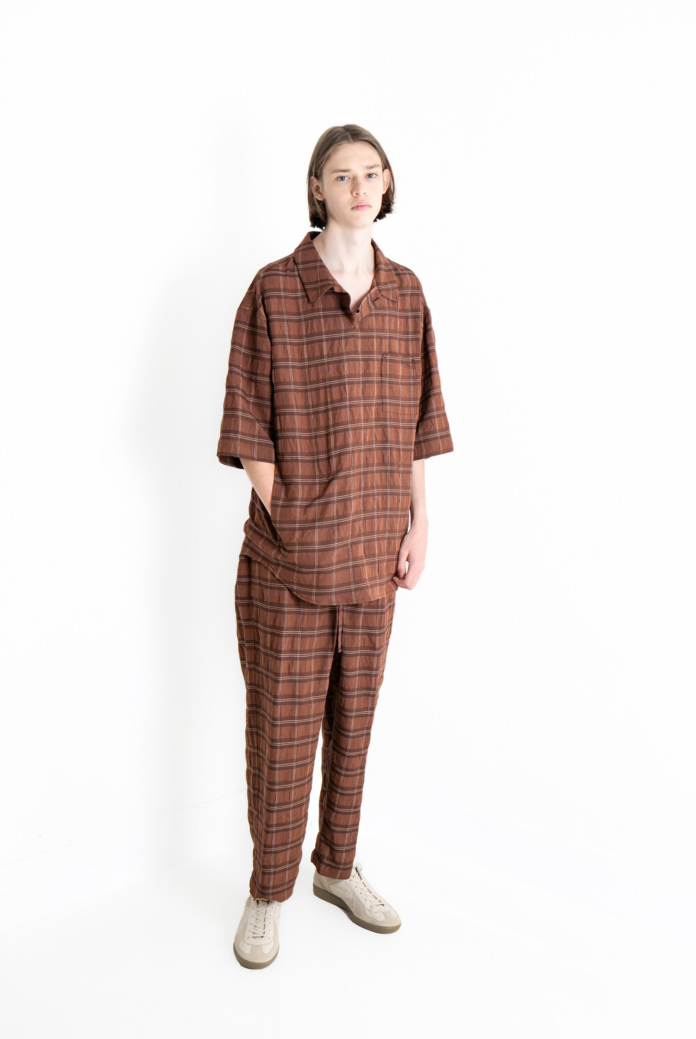 3가지 색의 원사로 이루어진 체크 무늬와 함께 자글자글한 표면감이 드러나며, 엘레강스한 뉘앙스에 내추럴이 더해진 듯한 모습입니다.