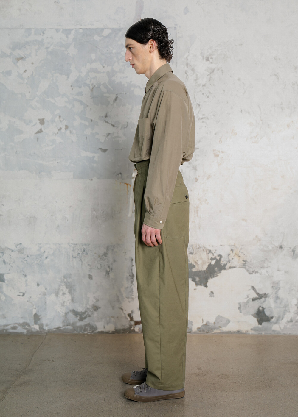 여유있는 테이퍼드 실루엣 형태를 취하며, 허리에 턱을 넣어 입체감을 더하였습니다.