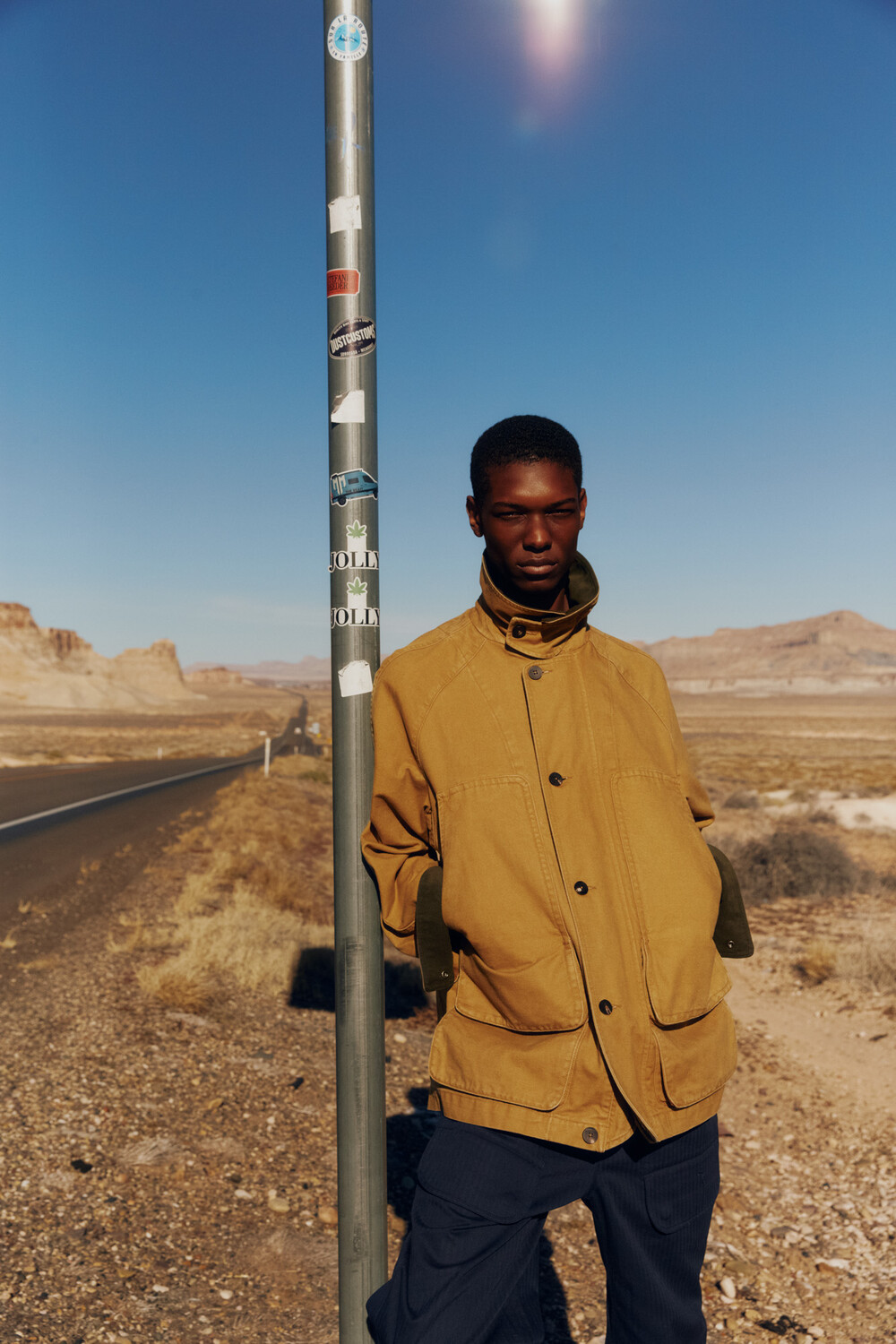 전면에는 대칭형 플랩 포켓과 버튼 여밈 디테일을 배치해 정제된 필드 자켓의 감성을 담았으며, 등판에는 운동성을 고려한 절개 라인과 **액션 플리츠(Action Pleats)**를 더해 고중량 원단임에도 유연하고 활동적인 구조를 완성했습니다.