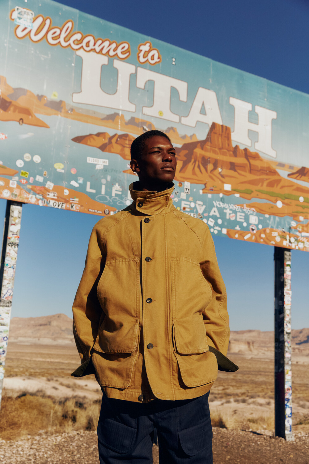 The front features symmetrical flap pockets with a button closure for a refined field-jacket finish. On the back, panel lines and action pleats are added for enhanced mobility, creating a sturdy yet active construction even in a heavyweight fabric.