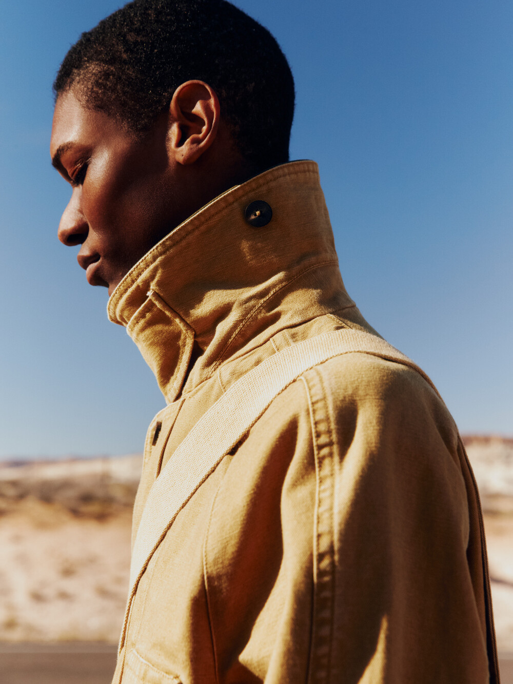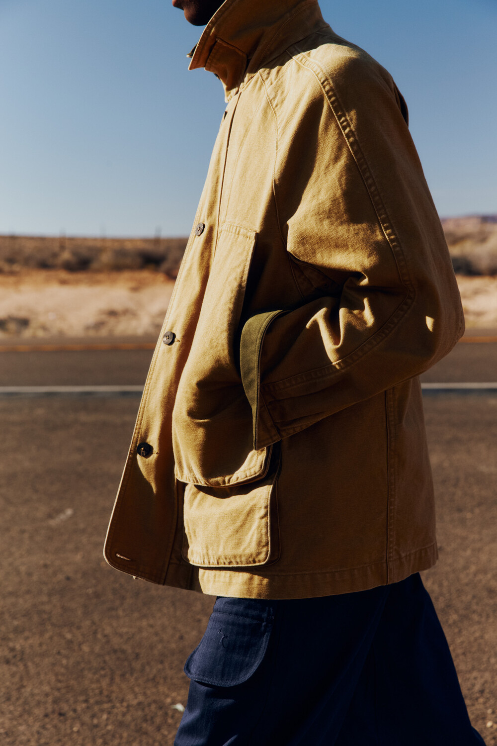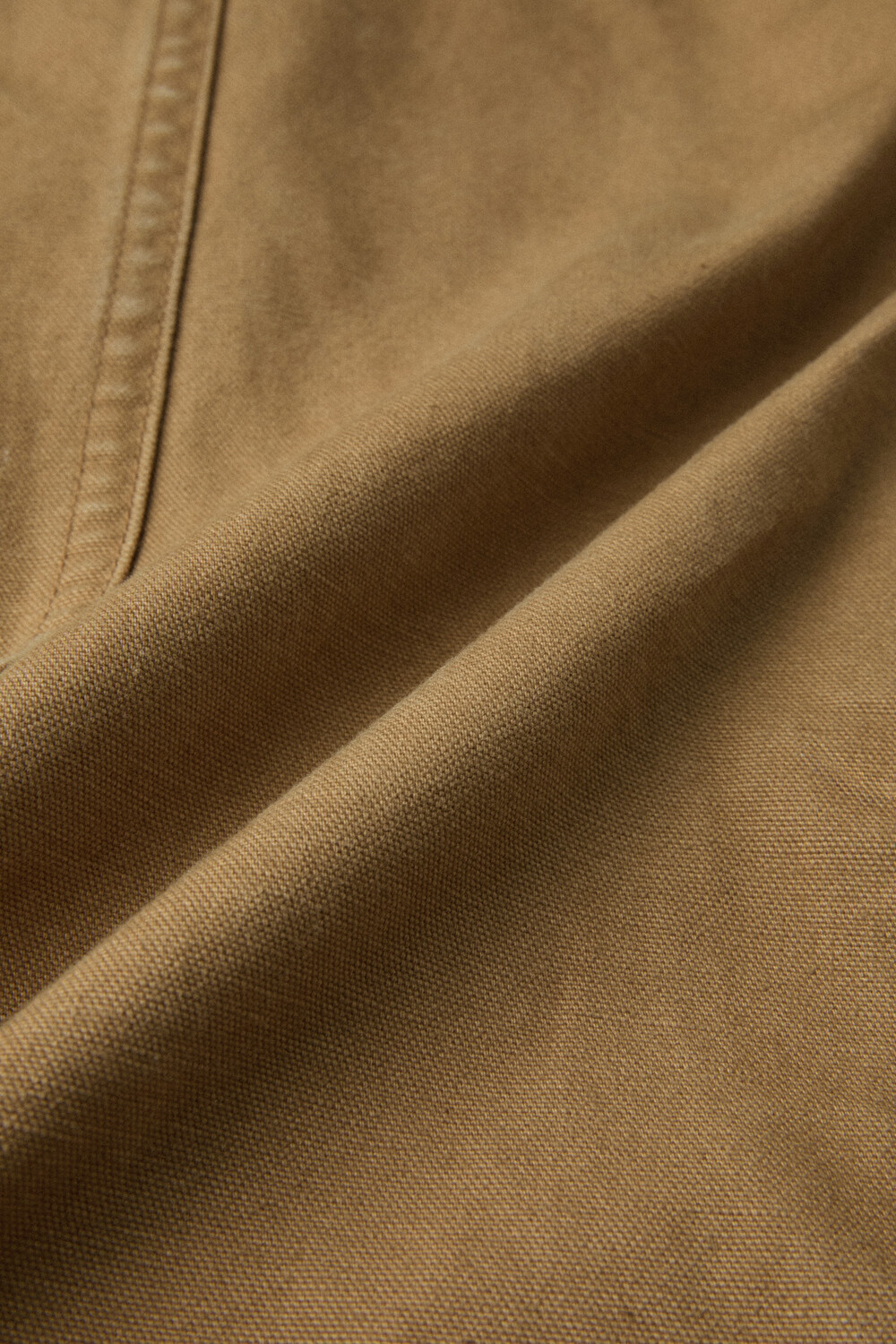 Designed with a relaxed silhouette for easy layering, it balances a clean length with an articulated pattern. Woven tighter and tougher than typical canvas, the fabric reveals a subtle, irregular horizontal grain that deepens in character over time—developing natural fading and a richer patina through wear and washing.