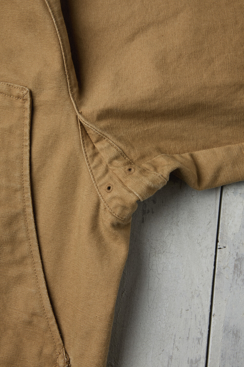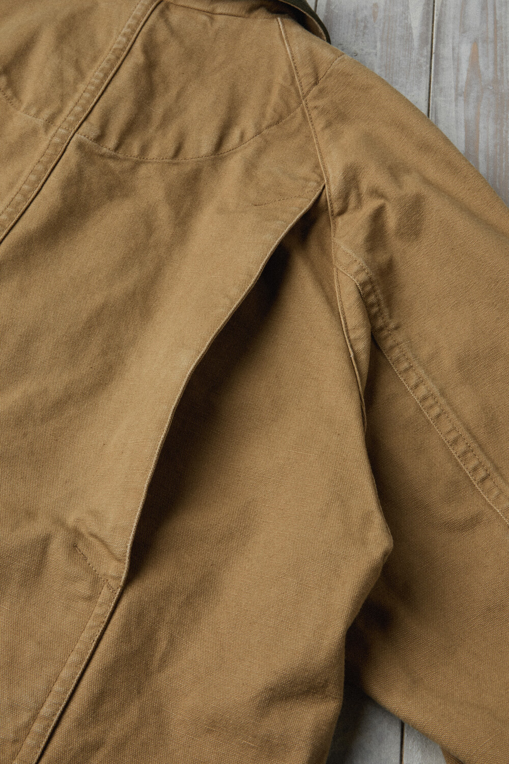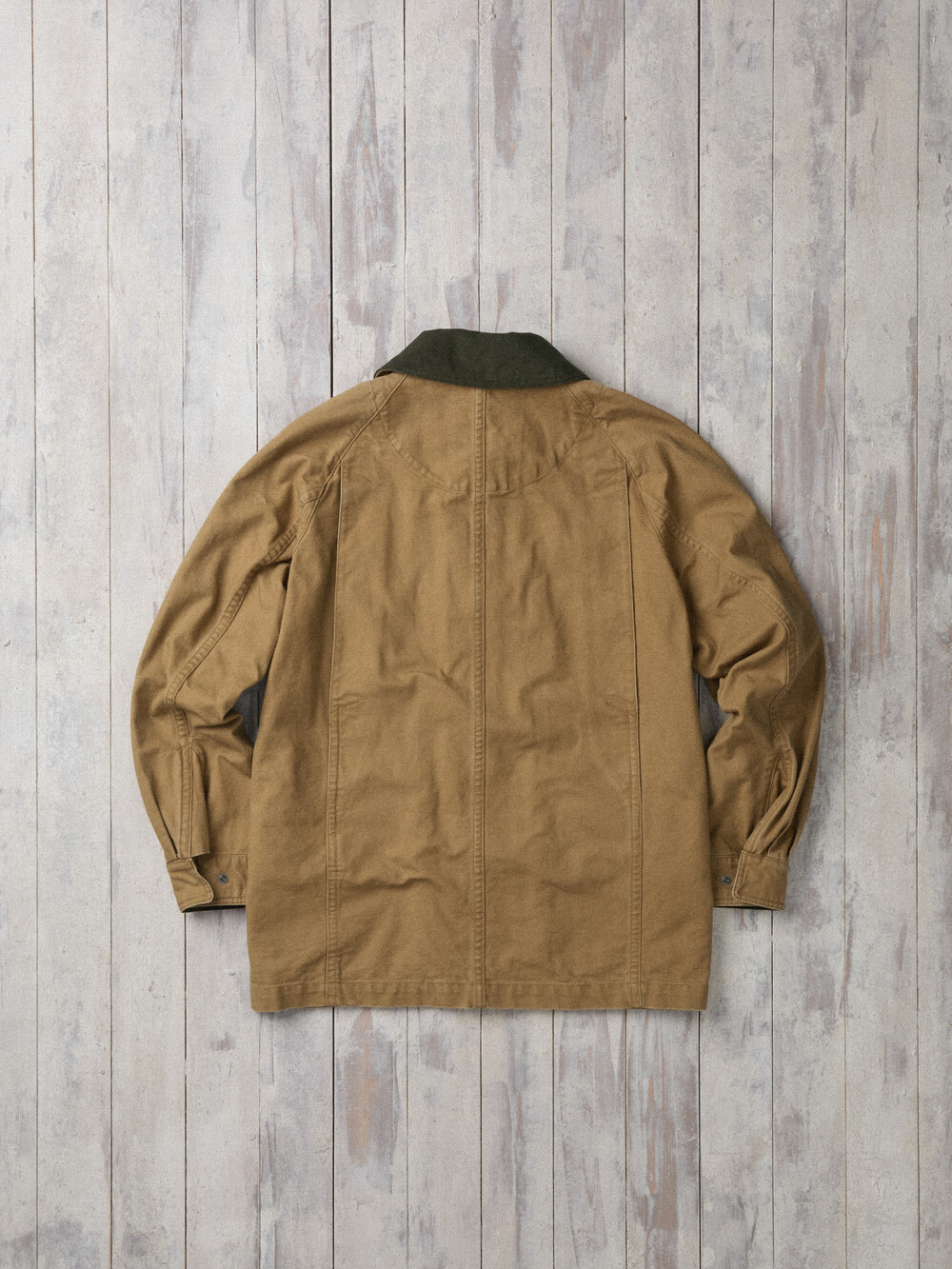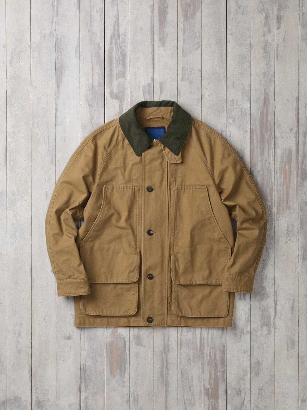 Based on a classic field jacket silhouette, this piece is crafted from CHKUMA&CO.’s Japanese Vintage Duck Canvas (42500DT). The 100% cotton, 457g/sqm heavyweight canvas offers a dense, durable structure while maintaining a supple hand feel—never overly rough—highlighting the fabric’s distinctive shape and presence. Its vintage character pairs naturally with a wide range of bottoms.