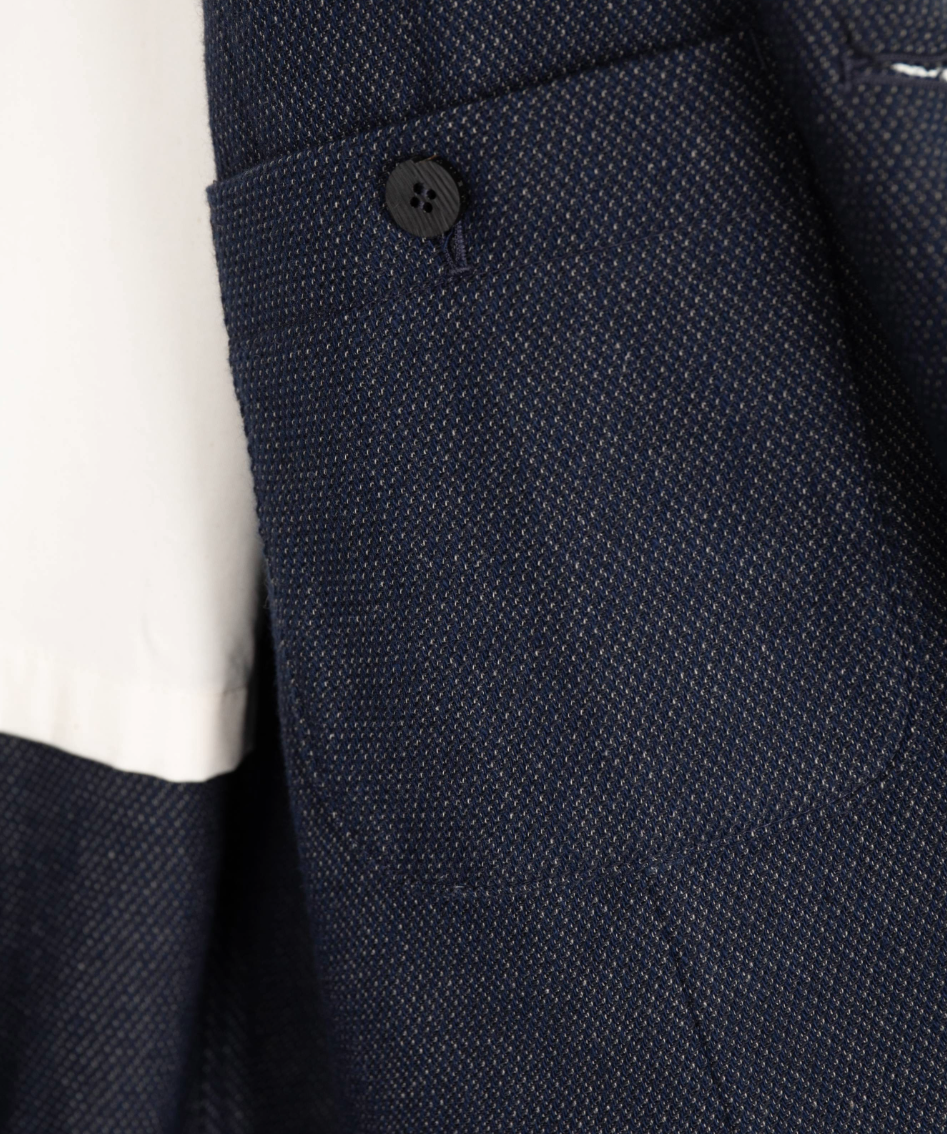 보통 자켓보다 여밈이 안 쪽으로 들어와 반 더블 여밈의 위치이며, 롤링 라펠로서 두번째 단추를 여미도록 만들어졌습니다.