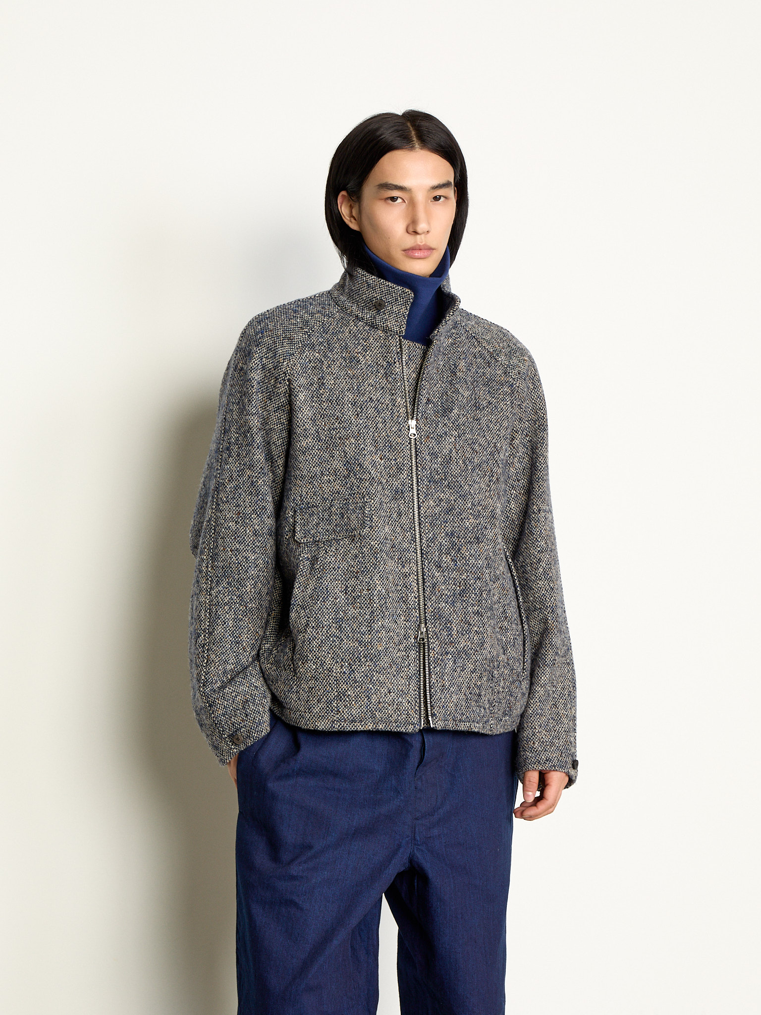 Woven from a heavyweight 590–620 g/m tweed, it balances density and softness — firm in structure yet fluid in movement.The raglan sleeves provide a relaxed shoulder line, and the zip-up front maintains a minimalist, composed shape.Designed with warmth and endurance in mind, this jacket stands as a refined outer layer even through deep winter.