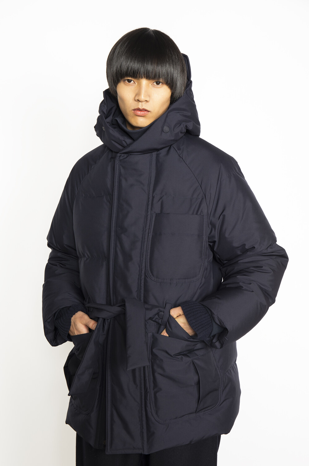 겉 모양은 로브 코트처럼 끈이 있어 다양한 실루엣을 연출할 수 있으며, 평상시에는 스냅으로 고정되어 있어서 벨트를 고정시킬 수 있습니다.