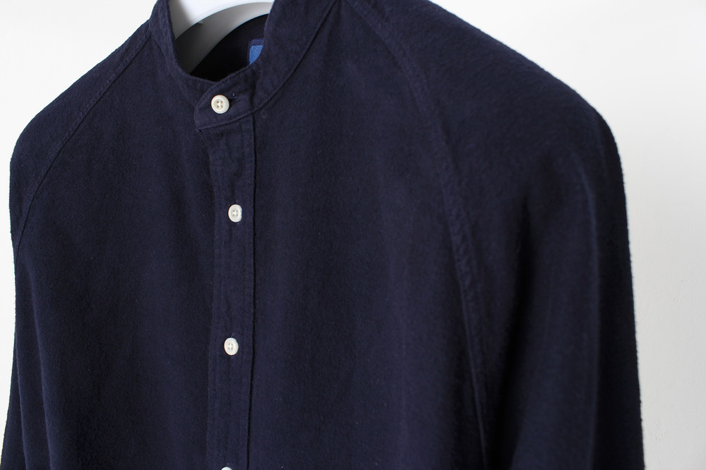 카라가 없이 밴드로만 구성되어지는 심플한 네크라인과 라글란 패턴은 소매의 봉제선에서 해방되어 어깨를 부드럽게 감싸며, 전체의 착용감은 적당한 여유감을 가져가는 편안한 핏입니다. 뒷판 요크의 샤링의 주름은 유니크한 느낌을 전달하며, 원단의 터치는 전체적으로 부드럽고, 도톰한 질감을 가지고 있습니다.