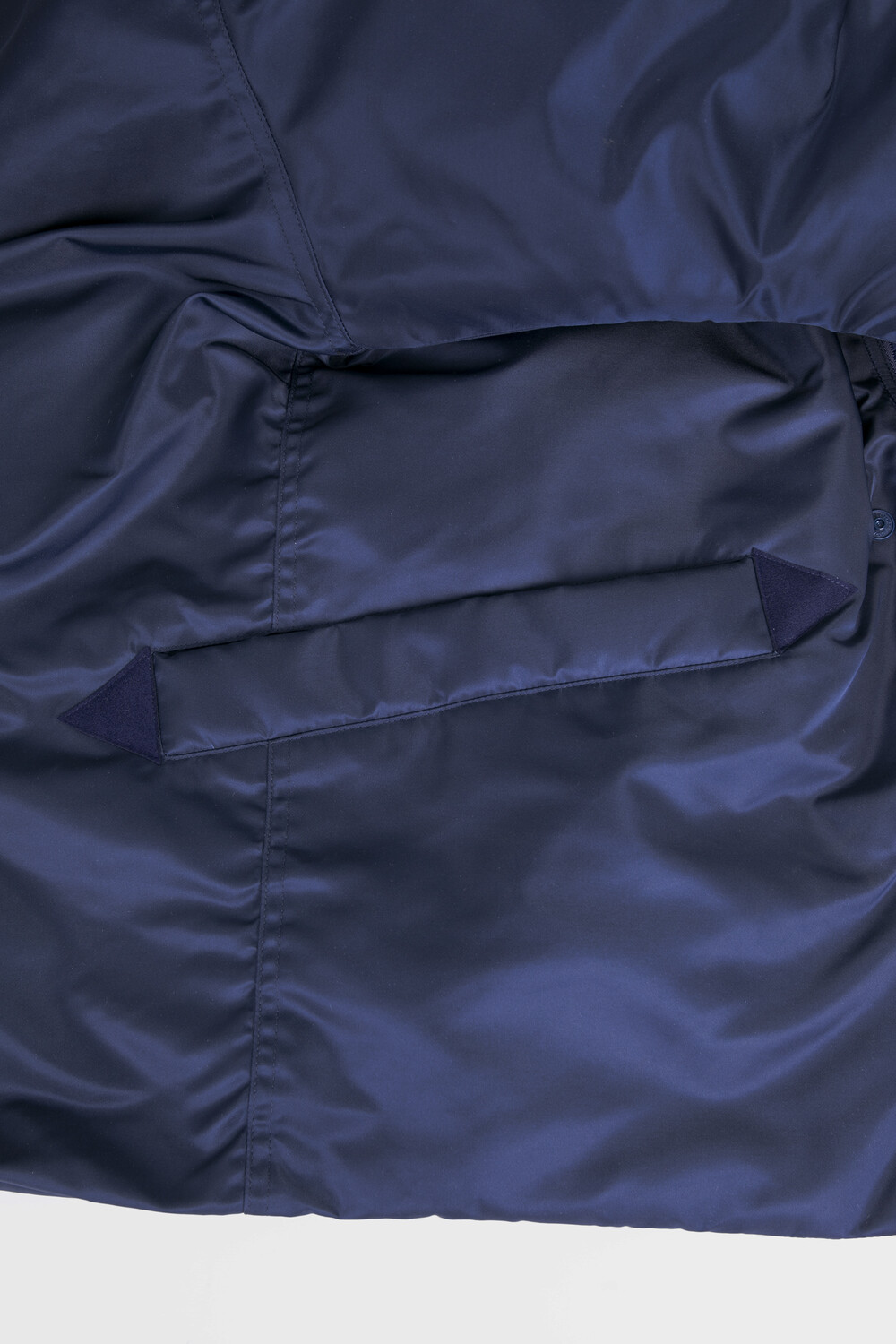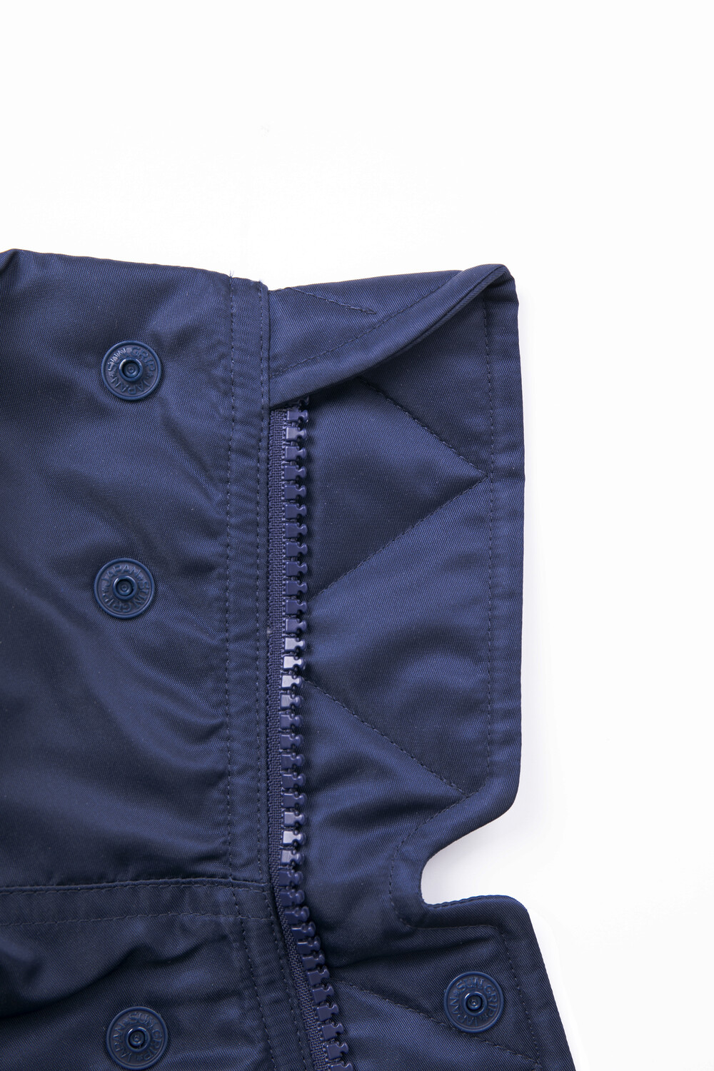 개구부는 YKK 2-WAY 지퍼를 사용하여 입고 벗기 편리하며, 네크와 상반신이 나눠지는 플라켓의 YKK 스냅을 이용하여 이중으로 바람을 막아 보온성을 높일 수 있도록 설계되었습니다.