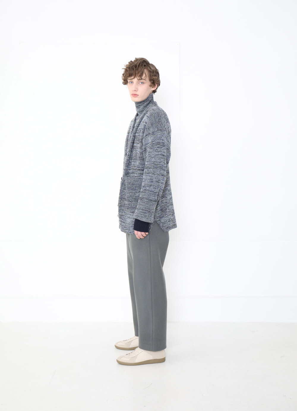 묵직한 중량감과 큰 포켓 디자인, 그리고 긴 듯한 실루엣이 착장시 유니크함을 선사합니다. 리얼 소뿔 단추와 원사의 조합이 매력적입니다.