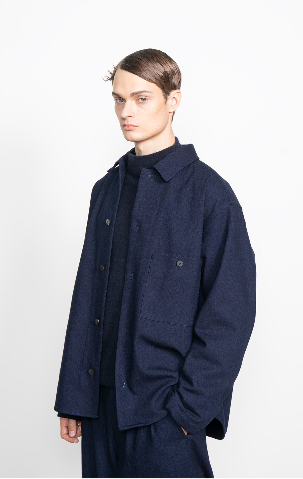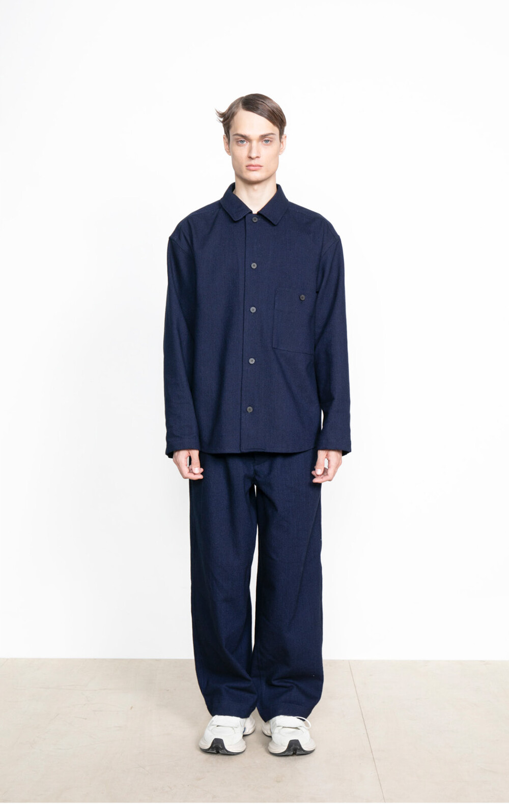 20번째 반복과차이, 린넨 프렌치 셔츠를 인디고 울로 재해석한 셔츠를 선보입니다.