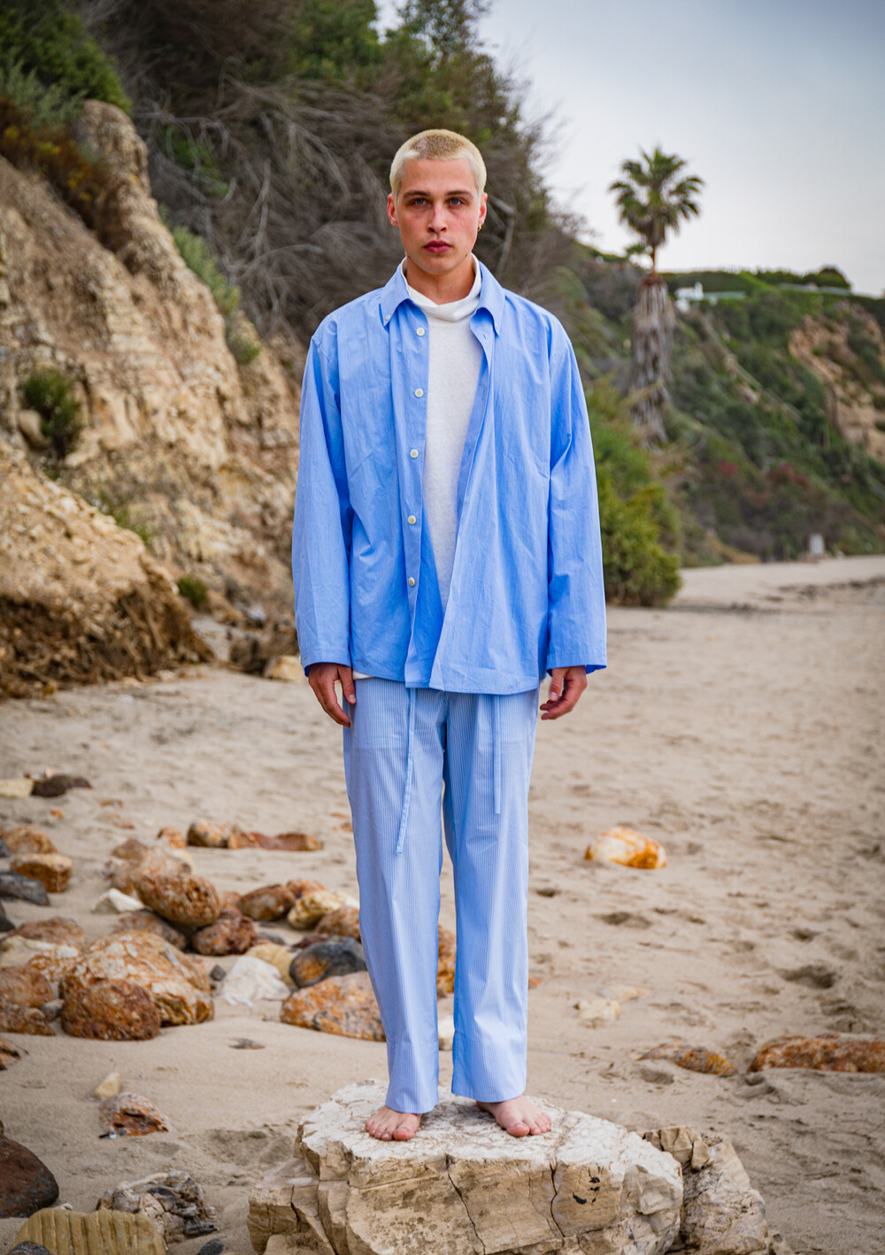 수직으로 떨어지는 푸른색의 스트라이프 패턴은 깔끔하면서도 쾌적한 분위기를 보이며, 한여름에도 시원하게 입으시기 좋습니다.