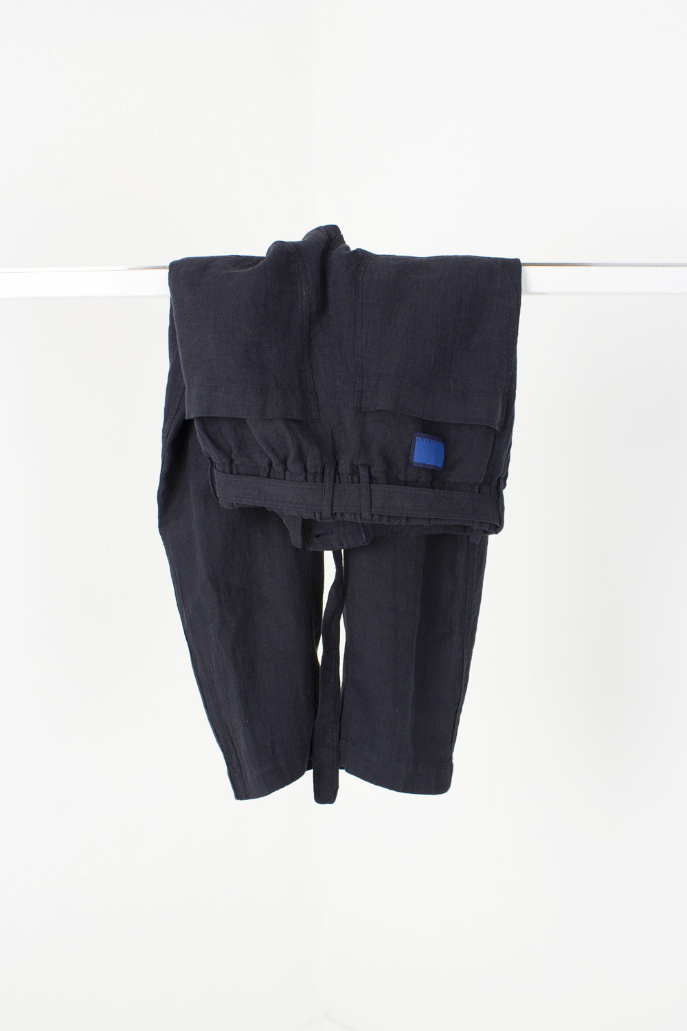린넨 100%의 부드러운 착용감이 매력적이며, 뒤에 고무 밴드 처리 되어 있고 벨트로 묶어서 입을수도 있어서 2사이즈 정도를 넘나듭니다.