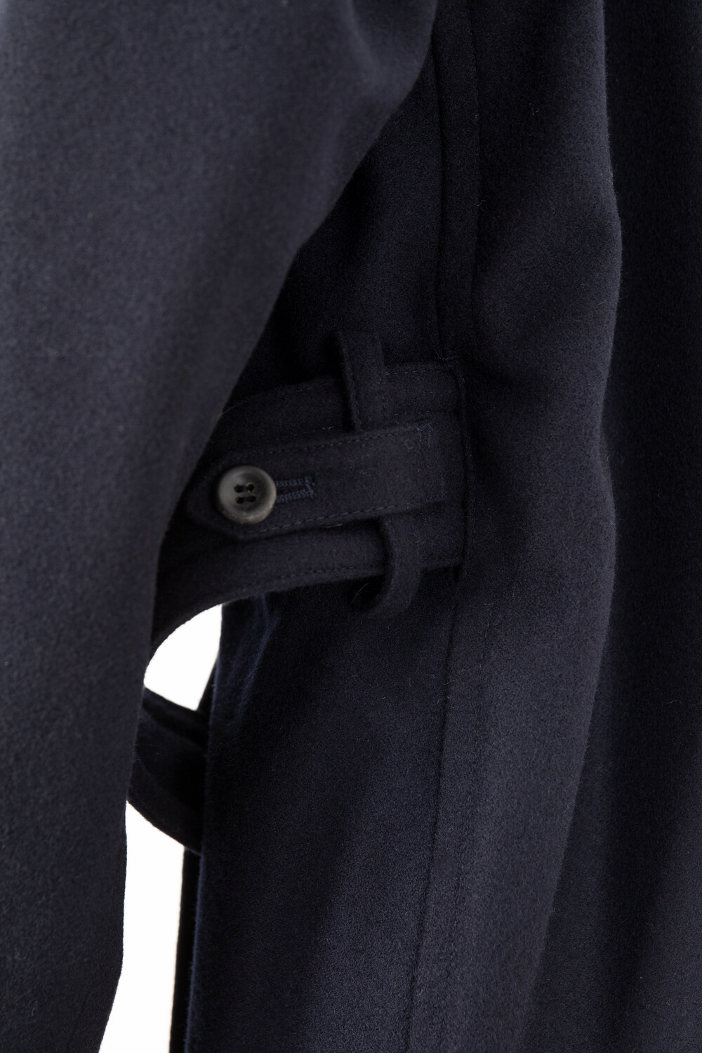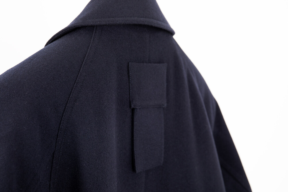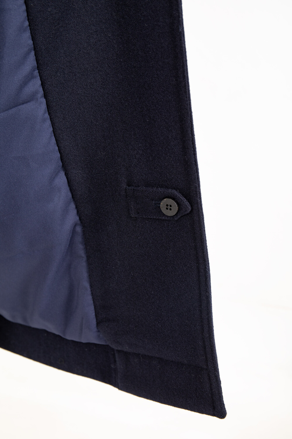 앞 여밈은 맨 윗 단추만 보여지는 모습에서 심플함을 보여주며 코트 안쪽에는 충전재가 패딩되어 보온성을 더해 줍니다. .