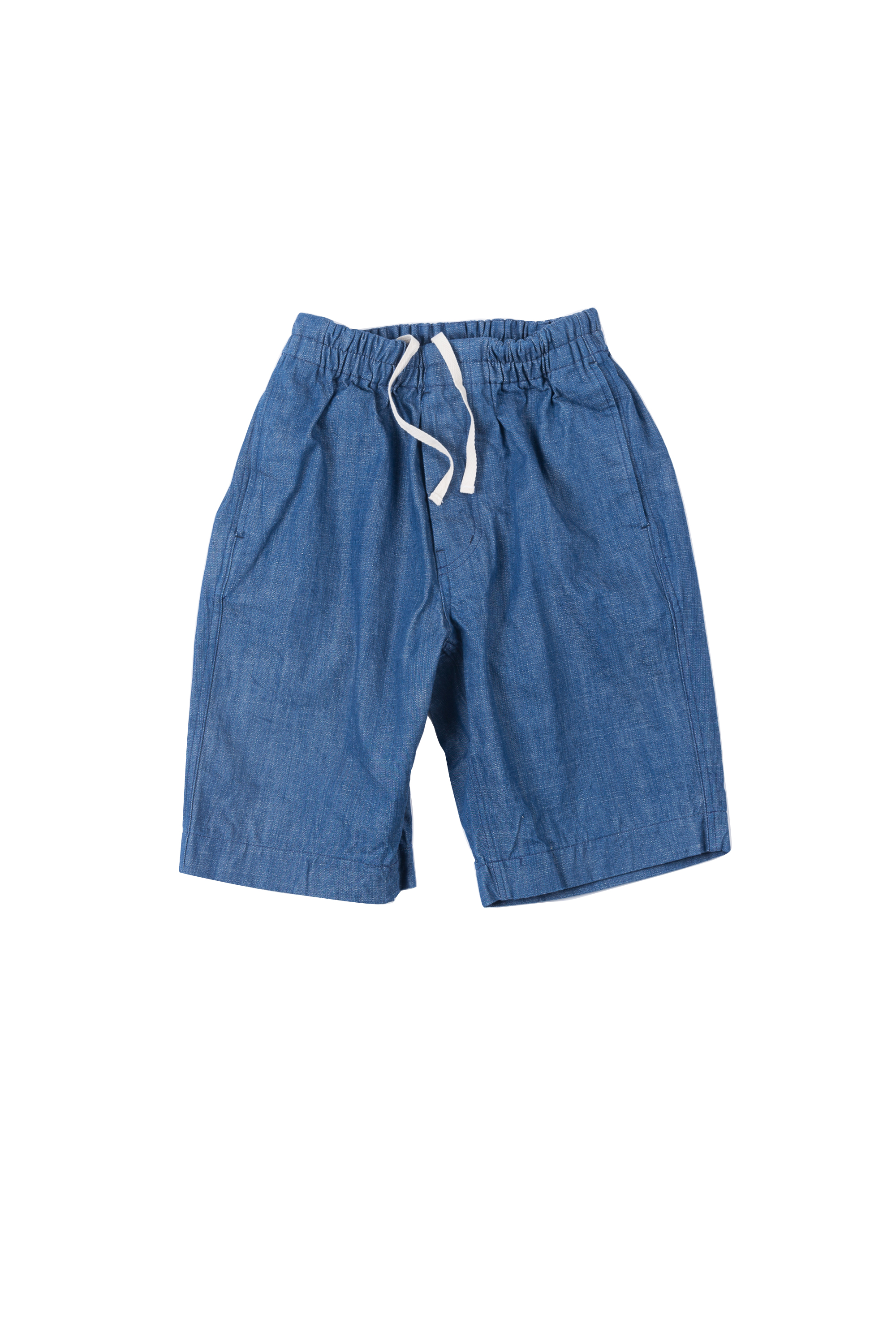 도큐먼트의 시그너쳐 팬츠인 파자마 팬츠의 짧은 쇼츠 모델입니다. 데님으로 유명한 일본 오카야마의 밝은 컬러의 데님으로 만들어져 있습니다. 포켓이 3개로 이루어져 있습니다. 앞쪽에는 단추로 되어 있으며, 허리에 밴드로 이루어져 있고, 이중으로 끈으로 조일 수 있도록 되어 있습니다. 넉넉한 바지 통으로 짧지 않은 무릎선까지 오며, 롤업해서 입을 수 있도록 겉과 안의 봉제가 같도록 하였습니다.