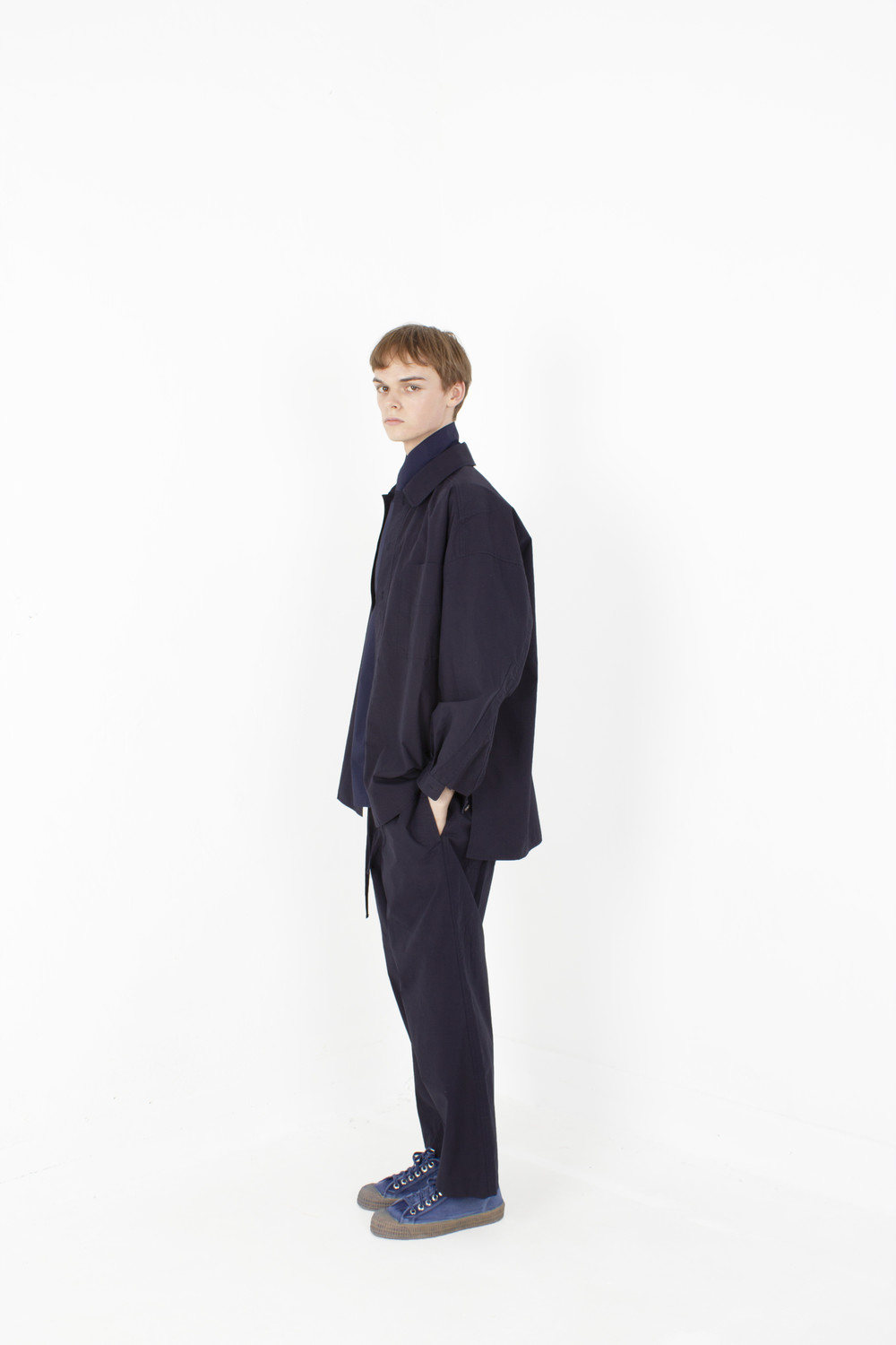 고밀도 TYPEWRITER 원단으로 타이프를 쳐도 될 만큼 바스락거린다고 해서 붙여진 이름입니다. 바삭거리는 터치감과 다크한 네이비 컬러에 루즈한 핏이 아우터처럼 걸쳐 입기 좋으며, 같은 원단으로 된 바지와 셋업으로도 구매가 가능합니다. 끝이 부드러운 카라와 루즈함을 살짝 드러내는 옆트임이 있으며, 소매를 걷어 있을 수 있도록 여유있는 사이즈와 독특한 소매 디자인이 특징입니다.