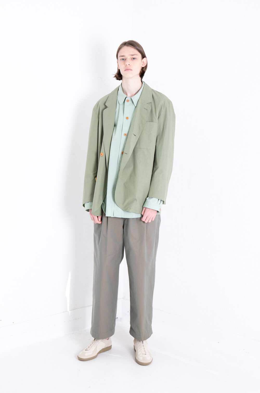청량감을 가진 컬러감으로 이번 시즌 새롭게 선보인 월넛 색상의 너트단추와도 조화로우며, 가볍고 편하게 즐기기 좋습니다.