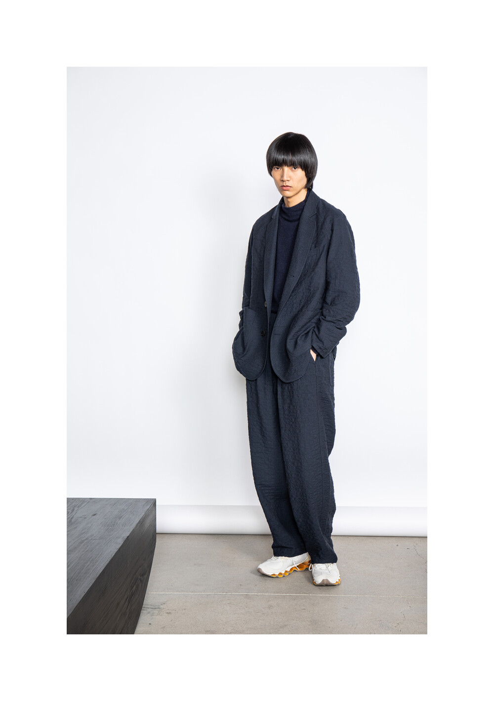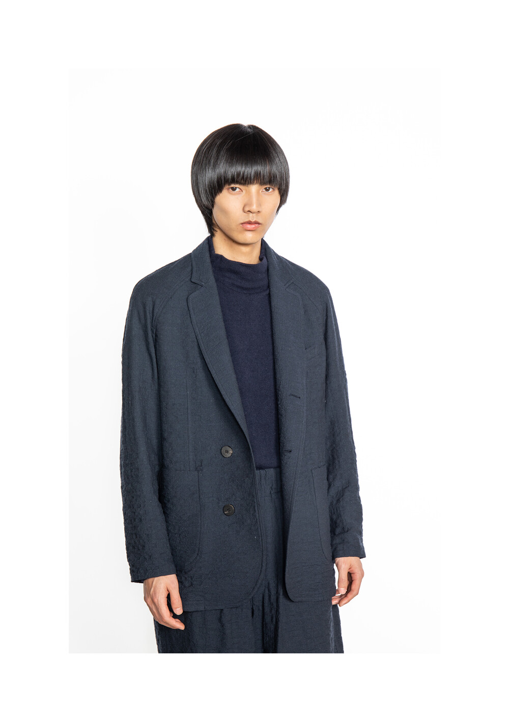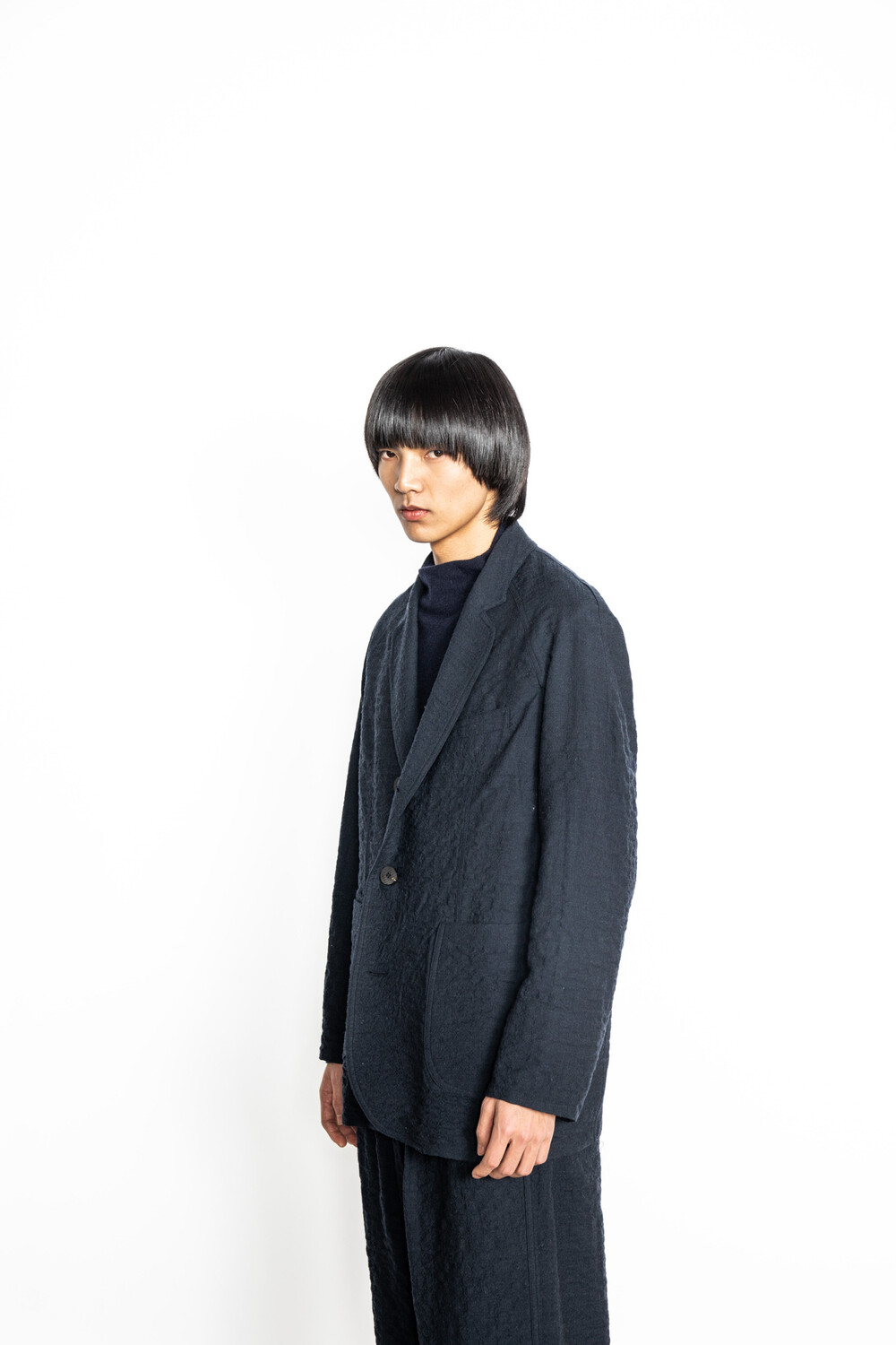 이태리에서 생산된 원단으로 가을 겨울용으로 제작되어진 시어서커 원단으로 WOOL 34 COTTON 25 POLY 41 혼방이며 도드라지는 표면감과 질감이 매력적인 제품으로 가을철 자켓으로 활용하기에 좋습니다. 여유 있는 사이즈감으로 유려한 실루엣을 나타내고 셋업으로 착용하였을 때 존재감을 더욱 드러냅니다..