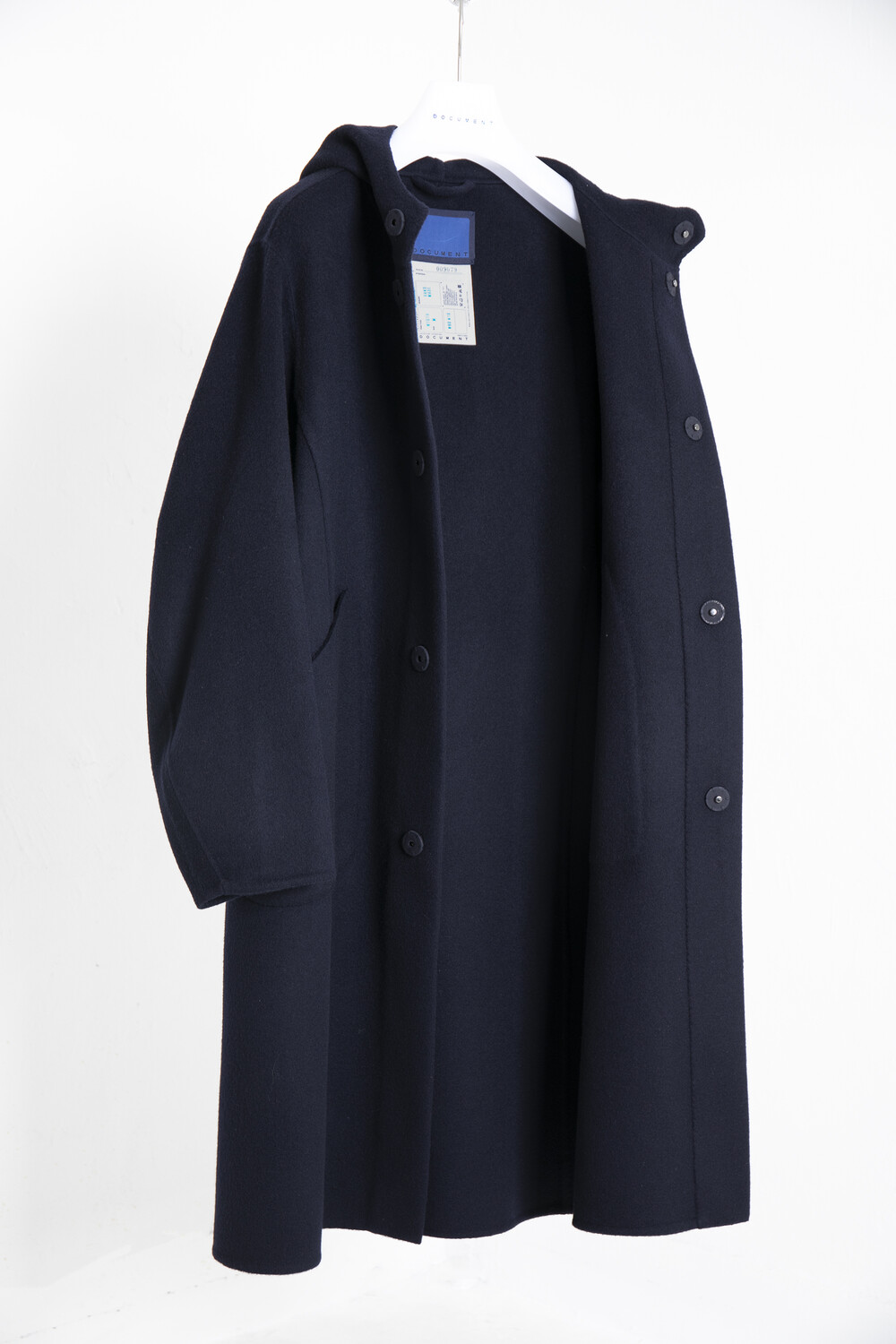 유려한 실루엣을 가지고 있는 후드가 있는 롱 코트입니다. 봉제에서 라벨과 스냅 버튼 부착까지 전 과정이 핸드 메이드로 이루어졌습니다. 착용감을 좋게 하기 위해 소매 안감은 큐프라 안감이 어깨까지만 핸드 스티치로 적용되었습니다, 앞판에 패치 포켓이 2개 있으며, 조금 위에 달린 듯 하여 단순함에서 오는 심플함에서 절묘한 리듬감을 선사합니다.후드 코트는 긴 기장의 밸런스를 위하여 큰 사이즈의 후드와 팔을 들어도 옷이 딸려오지 않는 캐주얼한 소매 각도가 큰 특징입니다. 소매는 살짝 걷어 올리면 , 특유의 소매 라인( 위는 크지만, 아래로 급격히 좁아드는) 이 살아나 도큐먼트 만의 후드 코트 실루엣을 느끼실 수 있습니다.